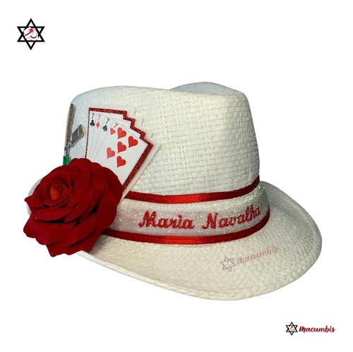 Fita bordada com nome da entidade e costurada no chapéu, apliques de cartas de baralhos em impressão de alta qualidade com eva brilhoso, rosa aveludada em estilo natural e pingente em metal de alta qualidade fixados com costura.
